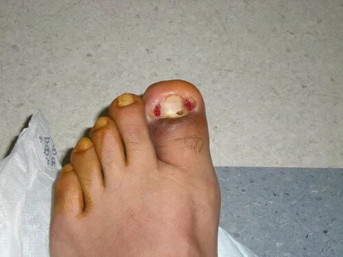 Ingrown toenails known as onychocryptosis is often painful and can be treated in various ways. Sometimes when left untreated it may become infected as this one is in the picture.